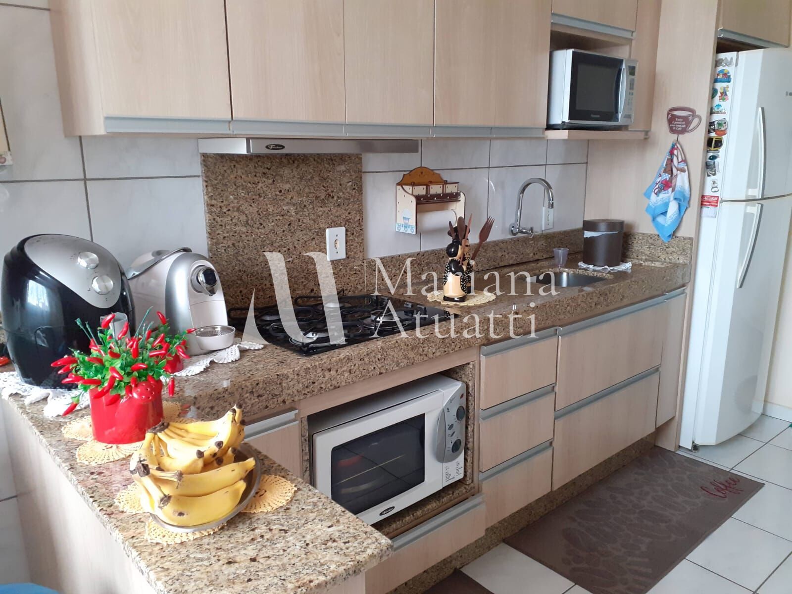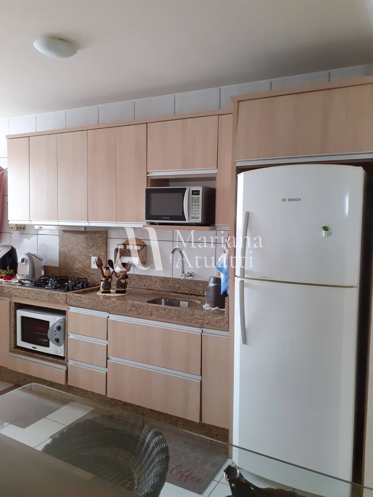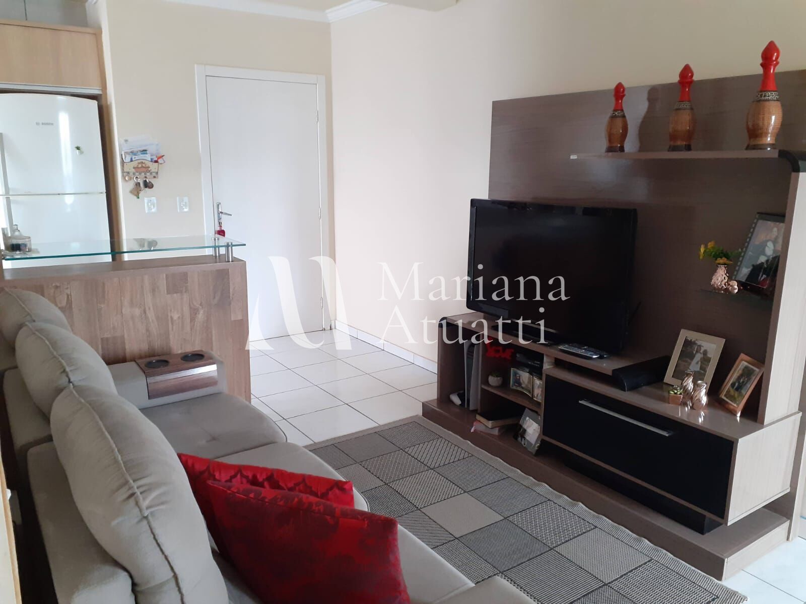 A sala é aconchegante e bem iluminada, com móveis planejados e decoração harmoniosa. A cozinha segue o mesmo padrão, com armários de qualidade e ótimo aproveitamento do espaço. Os quartos também contam com móveis em ótimo estado, prontos para uso. O banheiro possui acabamento moderno e funcional.